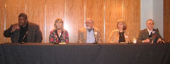 One of two author panels that took the stage on a program that was taped by Warner Cable for later broadcast. From left: Gary Phillips, Barbara Seranella, John Shannon, Taylor Smith, Bob. |